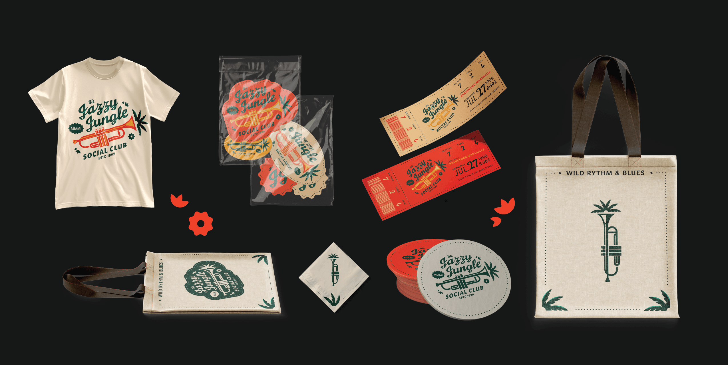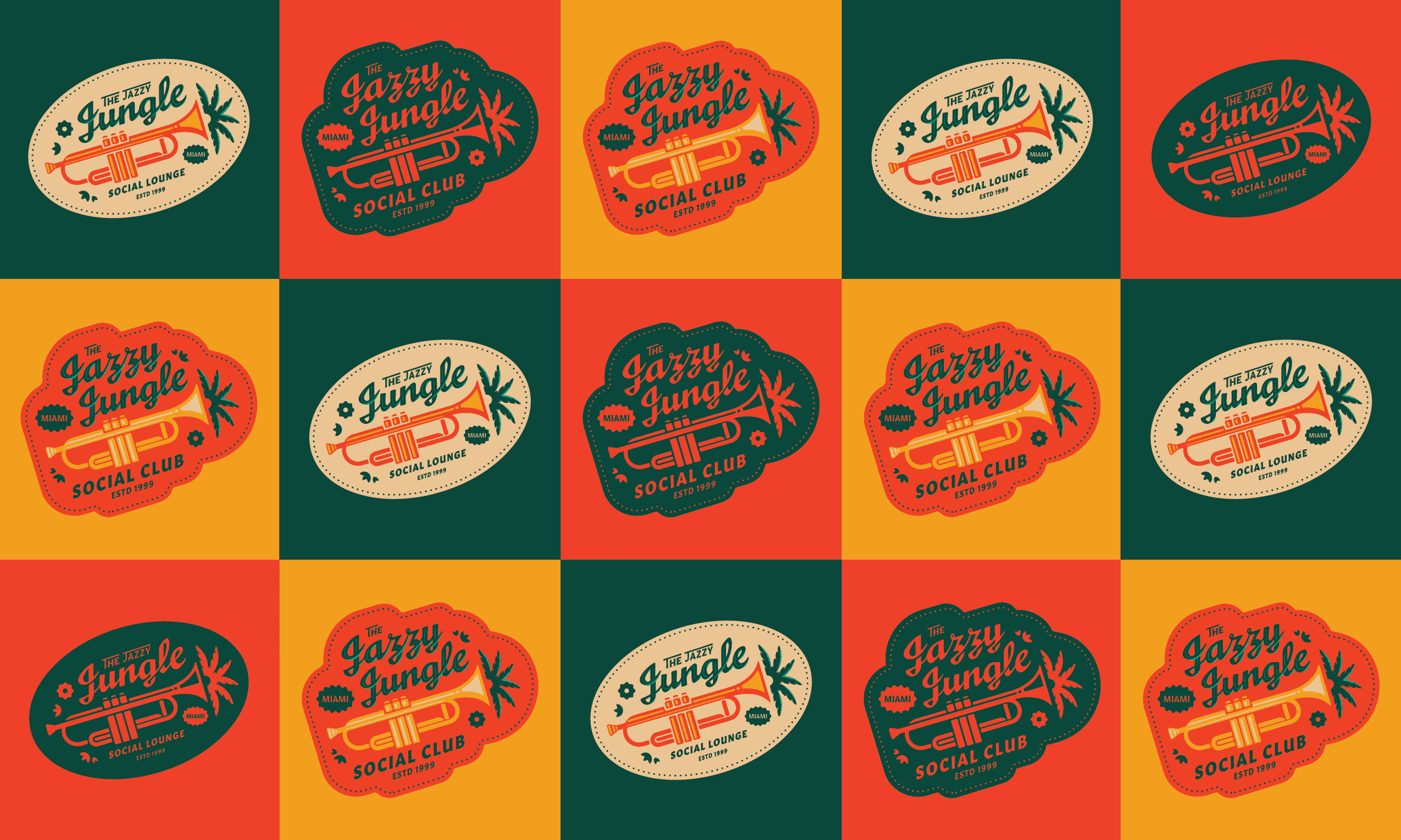 Create a badge design inspired by three randomly chosen words, two nouns and one adjective, challenging the designer to visually interpret jazzy, jungle, and social club into a cohesive identity.