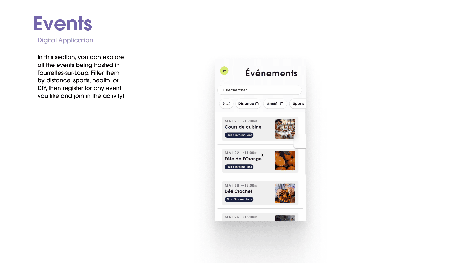 In this section, you can explore all the events being hosted in Tourrettes-sur Loup. Filter them by distance, sports, health, or DIY, then register for any event you like and join in the activity!