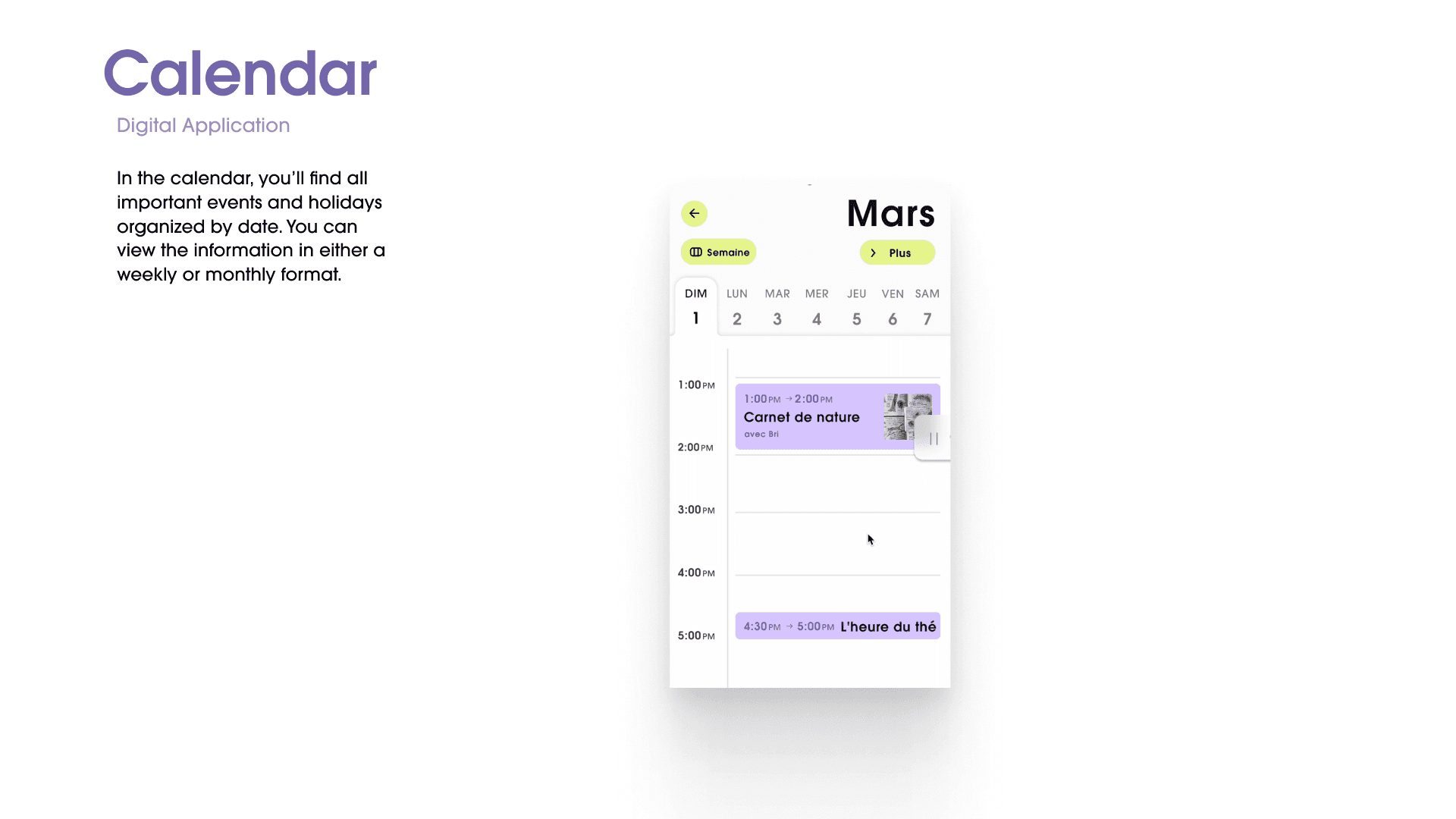 In the calendar, you’ll find all important events and holidays organized by date. You can view the information in either a weekly or a monthly format.