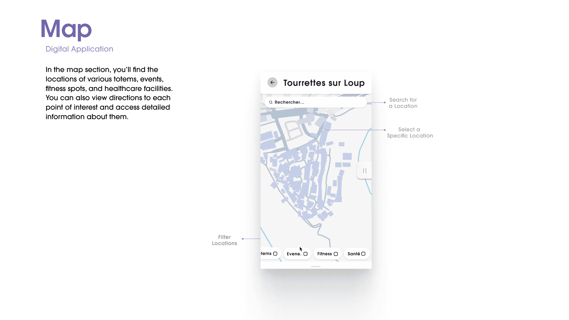 In the map section, you’ll find the locations of various totems, events, fitness spots, and healthcare facilities. You can also view directions to each point of interest and access detailed information about them.
